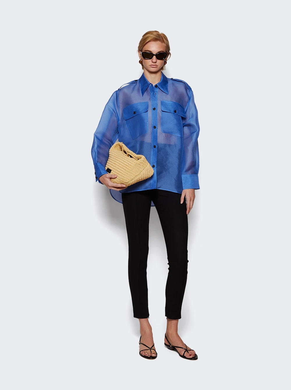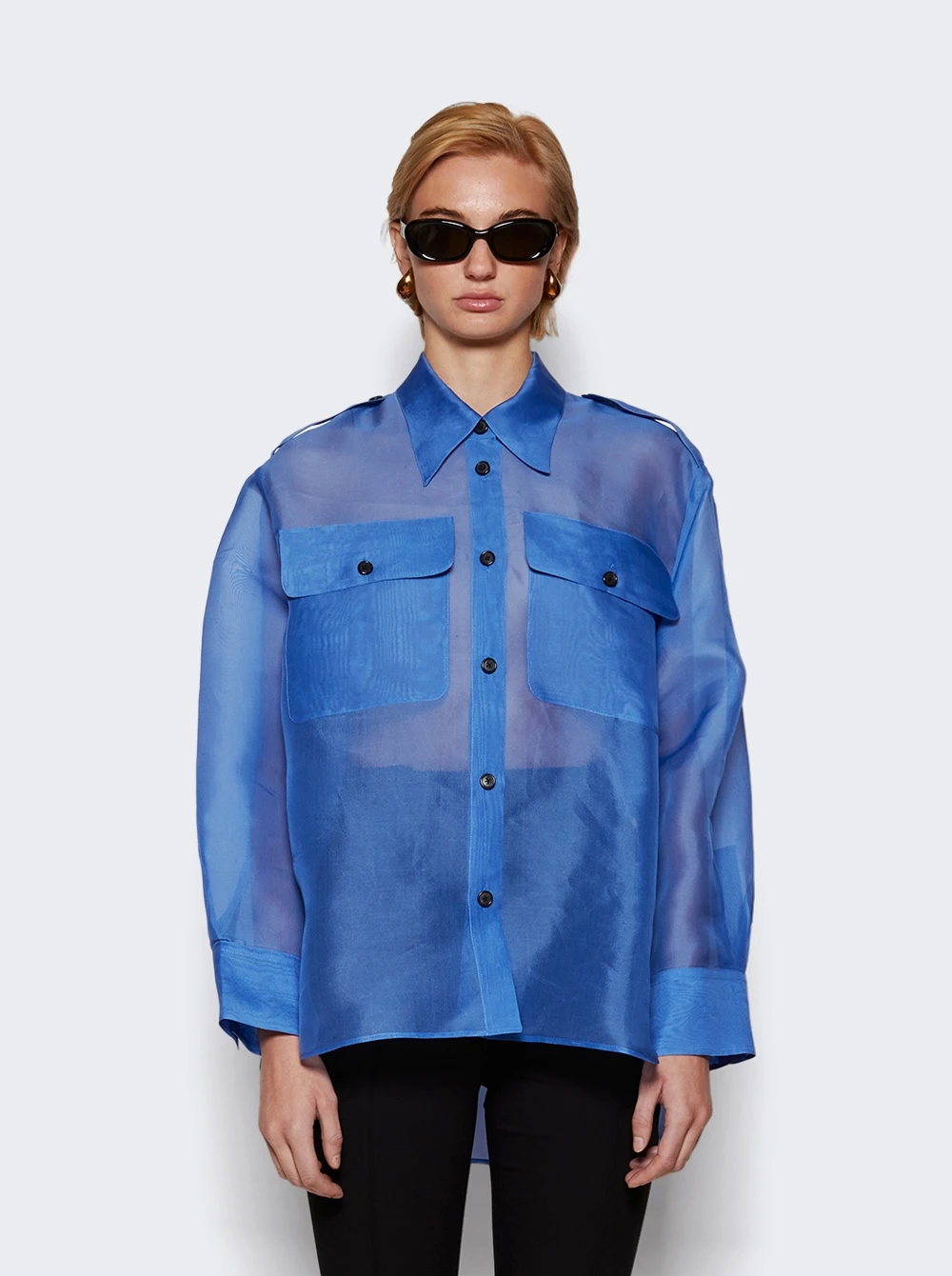 - An oversized organza button-up