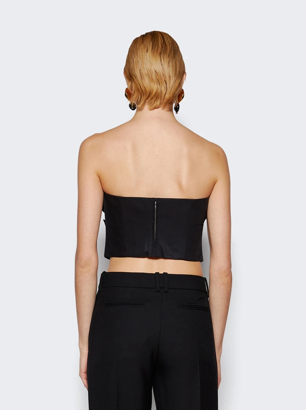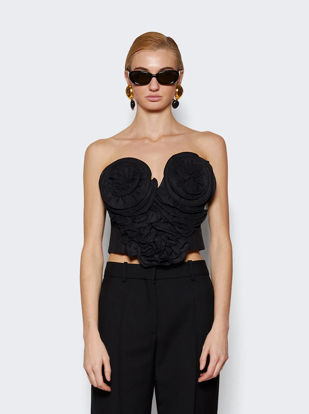 - Strapless top with ruffle applique covering the front bodice